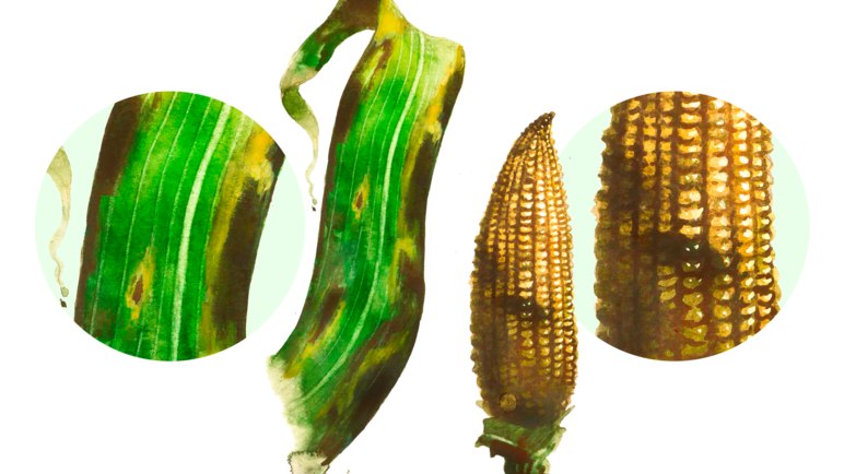 🔷 Болезнь поражает всходы, листья, початки, зерна кукурузы. На листьях взрослых растений образуются серовато-рыжие или соломенно-желтые продольные пятна, с темно-коричневым центром, веретенообразной или эллиптической формы, ограниченные жилками листьев. Длина пятен до 4 см, ширина до 6 мм. Пятна сливаются и возникают большие участки отмершей ткани.