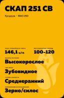 СКАП 251 СВ - гибрид кукурузы (Zea mays L.). Среднеранний, ФАО 250 гибрид двойного назначения: зерно и силос. Возможно возделывание по экстенсивной технологии. Обладает феноменальной устойчивостью к полеганию.
