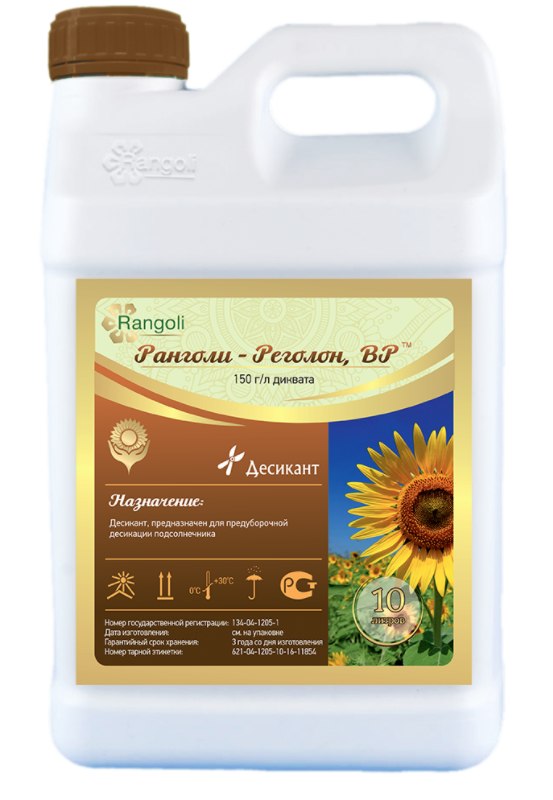 Механизм действия: Ранголи-Реголон десикант для подсушивания растений, ускоренного созревания и облегчения механизированной уборки культуры. Обладает контактным действием. Препарат нарушает физиологические и биохимические процессы в растении, что ведет к ослаблению водоудерживающей способности тканей и гибели клеток, что приводит к усыханию растений. Признаки действия препарата – постепенное увядание, пожелтение, затем усыхание листьев и генеративных органов.