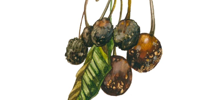 - Форма плодовой гнили. Проявляется после налива плодов. Коричневые пятна на плодах быстро разрастаются, образуются подушечки спороношения. При низкой влажности спороношение отсутствует, плоды приобретают сине-черную окраску, позднее мумифицируются. Поврежденные плоды остаются на дереве. Инфекция проникает в плодущие ветви, на них появляются темные вдавленные пятна, если поражение охватывает ветку кольцом, то ее вершина усыхает.