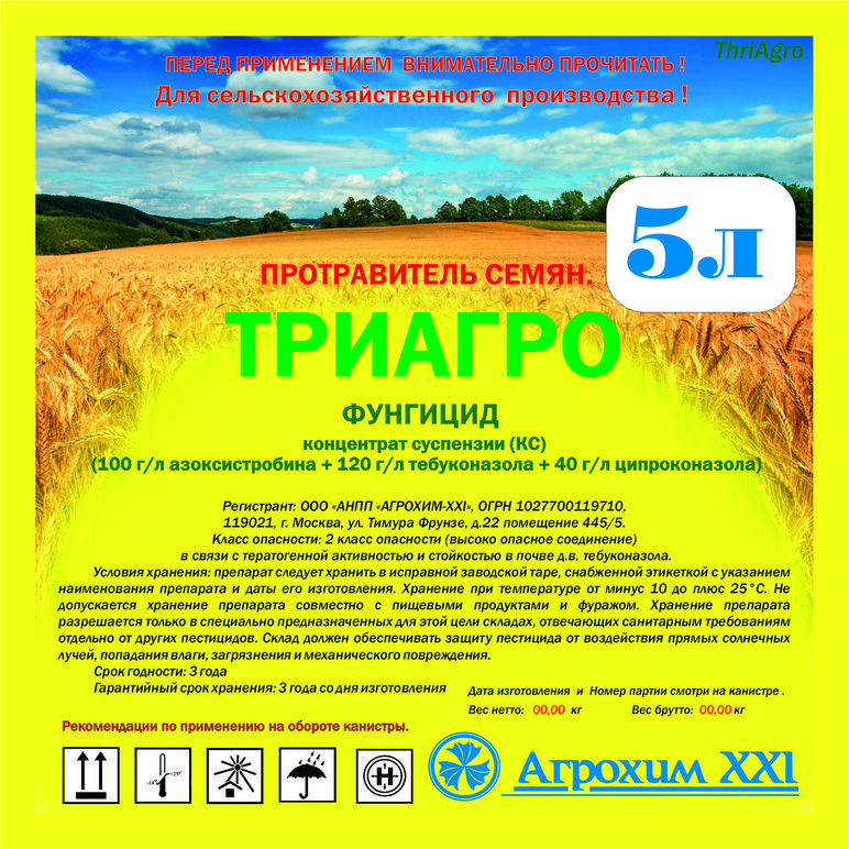 Характеристика действующего вещества: ТриАгро - новейший смесевой трехкомпонентный фунгицид. Его действующее вещества азоксистробин + тебуконазол + ципроконазол идеально дополняют друг друга и позволяют эффективно бороться как с поверхностными так и с внутренними инфекциями зерновки. Каждый из представленных компонентов является достаточно эффективным фунгицидом. Азоксистробин - имеет длительный защитный эффект против широкого спектра возбудителей четырех различных классов: аскомицеты, дейтеромицеты, базидиомицеты и оомицеты. Тебуконазол и ципроконазол относятся к классу триазолов. Триазолы могут применяться для профилактических обработок или для обработок на ранних фазах развития болезни. Однако, в большинстве случаев, если фитопотагены уже появились на зараженных растениях, триазольные фунгициды окажутся неэффективными. Таким образом представленная в ТриАгро комбинация различных фунгицидов позволяет решать целый комплекс проблем, вызванных заболеваниями зерновых.