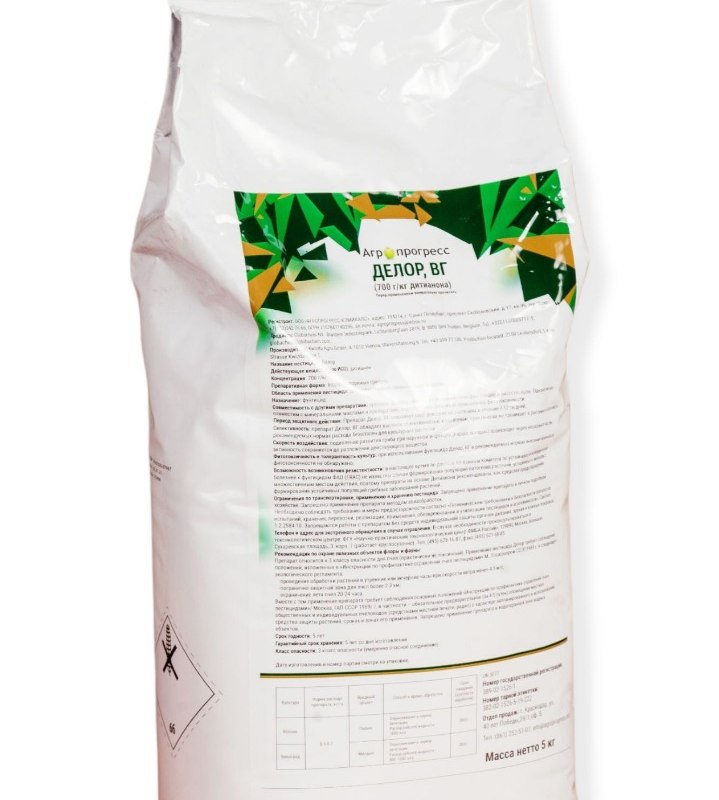 Делор, ВГ - контактный фунгицид с защитным действием для борьбы с возбудителями заболеваний плодовых культур и винограда. Образует на растении дождеустойчивый защитный слой с отличной прилипаемостью, эффективно подавляющий прорастание грибных спор. Используется для профилактического применения, обеспечивая надежную защиту листьев, плодов и ягод.