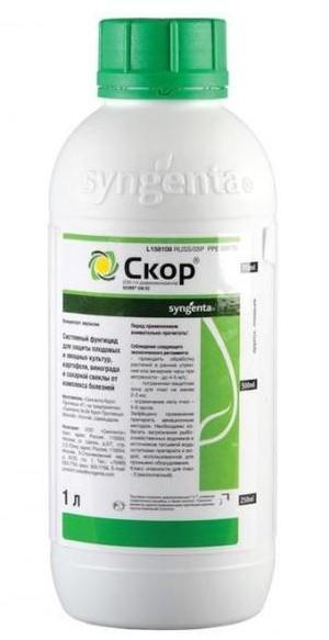 Скор, КЭ - системный фунгицид с длительным профилактическим и выраженным лечебным действием предназначен для защиты: томатов, моркови и картофеля — от альтернариоза, винограда — от черной гнили и оидиума, плодовых — от парши, мучнистой росы, альтернариоза, клястероспориоза, курчавости и др.