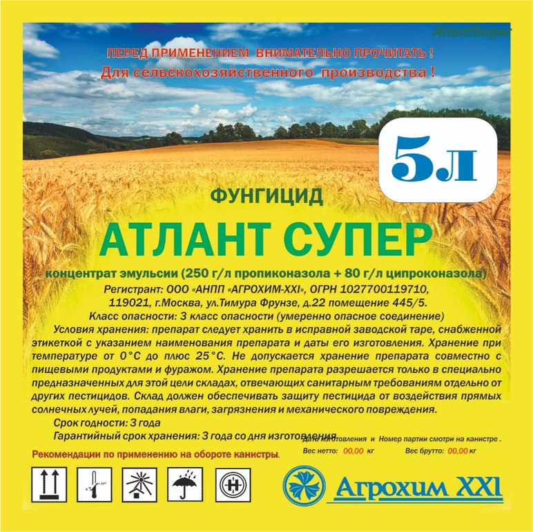 Механизм действия: АтлантСупер - препарат системного действия, после попадания на листья продвигается акропетально по ксилеме. Он обладает продолжительным защитным, лечащим и искореняющим действием на возбудителей болезней. Действующие вещества нарушают процессы синтеза эрго стеролов у патогенных грибов. Тем самым прекращают дальнейшее развитие грибов и подавляют у них спорообразование.