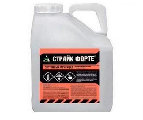 Приготовление рабочего раствора: сначала рекомендуется приготовить маточный раствор препарата. Отмеренное количество Страйка Форте растворяют в небольшом количестве воды (ведро) и тщательно перемешивают до получения однородной суспензии. Бак опрыскивателя заполняют водой на 1/3 объема, включают мешалку и заливают маточный раствор. Доливают бак опрыскивателя водой до необходимого объема с одновременным перемешиванием. Перемешивание продолжают и во время опрыскивания.