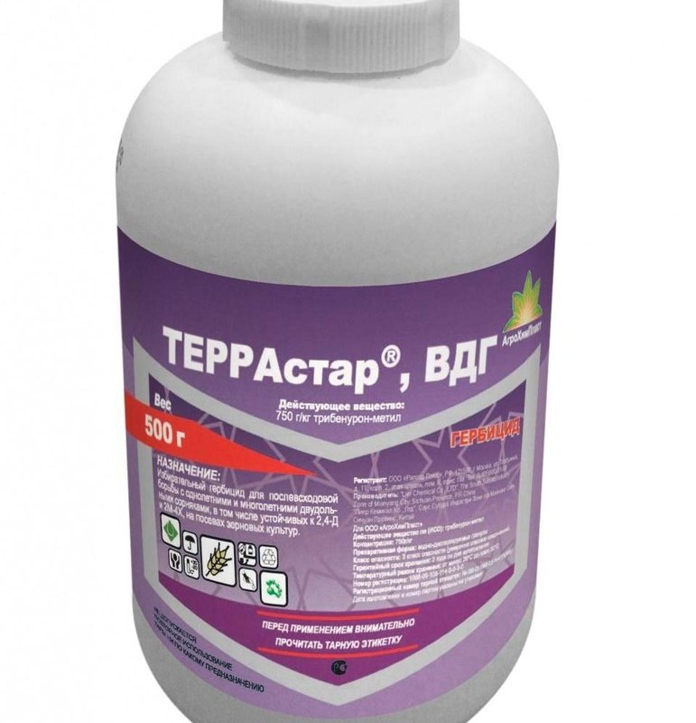 Механизм действия: ТЕРРАстар оказывает наиболее сильное действие в период активного роста молодых сорных растений. Его следует применять в стадии 2–4 листьев сорняков. Появление симптомов зависит от вида сорняков, стадии роста и погодных условий. Первые симптомы, в том числе хлороз, некроз появляются через несколько дней после обработки, а через 1–2 недели сорняки погибают. При обработке менее чувствительных сорняков, в более поздние сроки развития и при сухой погоде симптомы появляются позднее. Некоторые среднечувствительные сорняки остаются зелеными в течение длительного времени, однако, их развитие угнетено. Через два часа после внесения препарата обработанные сорняки останавливаются в росте и перестают поглощать из почвы воду и минеральные вещества. Таким образом, высокая избирательность ТЕРРАстара в сочетании с весьма эффективным контролем сорняков на раннем этапе их развития обеспечивает высокую урожайность зерновых.
