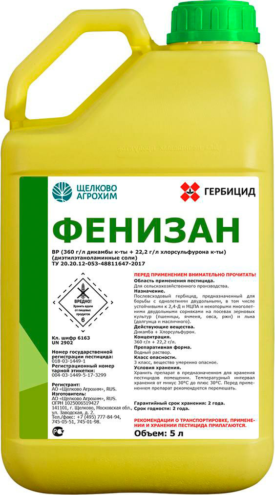 Совместимость c другими пестицидами: Фенизан совместим с другими гербицидами, фунгицидами и инсектицидами. Рекомендуется перед применением провести тест на физико-химическую совместимость препаративных форм.
