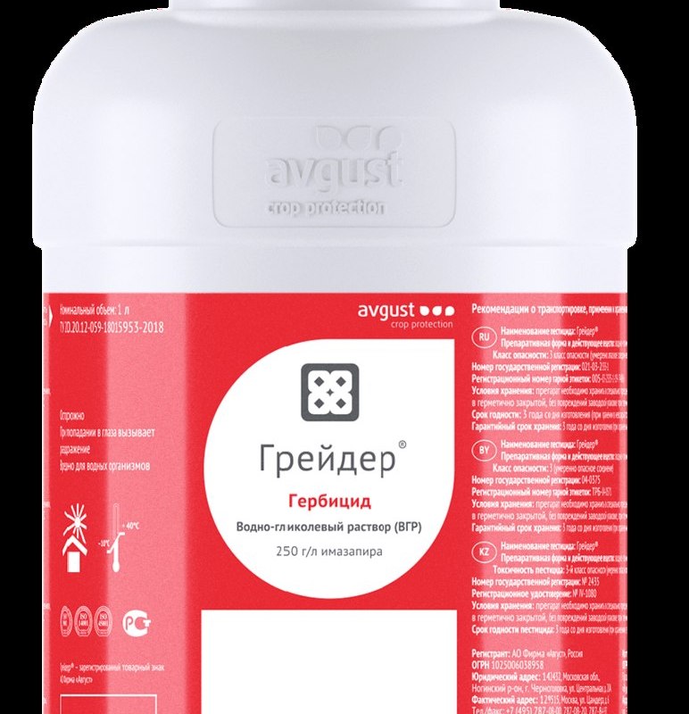 Особенности применения: на эффективность препарата против сорняков и его фитотоксичность к обрабатываемой культуре могут влиять различные факторы. В первую очередь это погодные и почвенно-климатические условия, сортовые особенности культуры, фаза развития культуры и сорняков в момент обработки, норма расхода, наличие резистентных биотипов сорняков, использование Грейдера в баковых смесях с пестицидами и агрохимикатами - антагонистами препарата, несоответствующая или плохо отрегулированная техника для внесения и другие факторы.