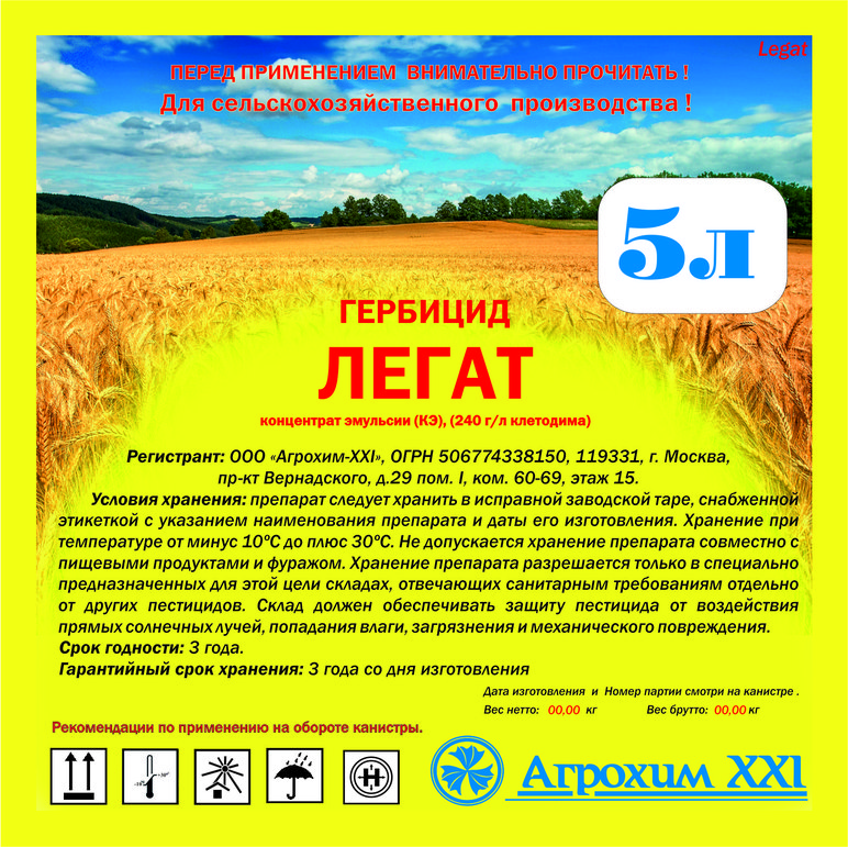 Легат, КЭ - высокоэффективный системный гербицид для борьбы с однолетними и многолетними злаковыми сорняками в посевах сахарной свеклы, подсолнечника, сои.