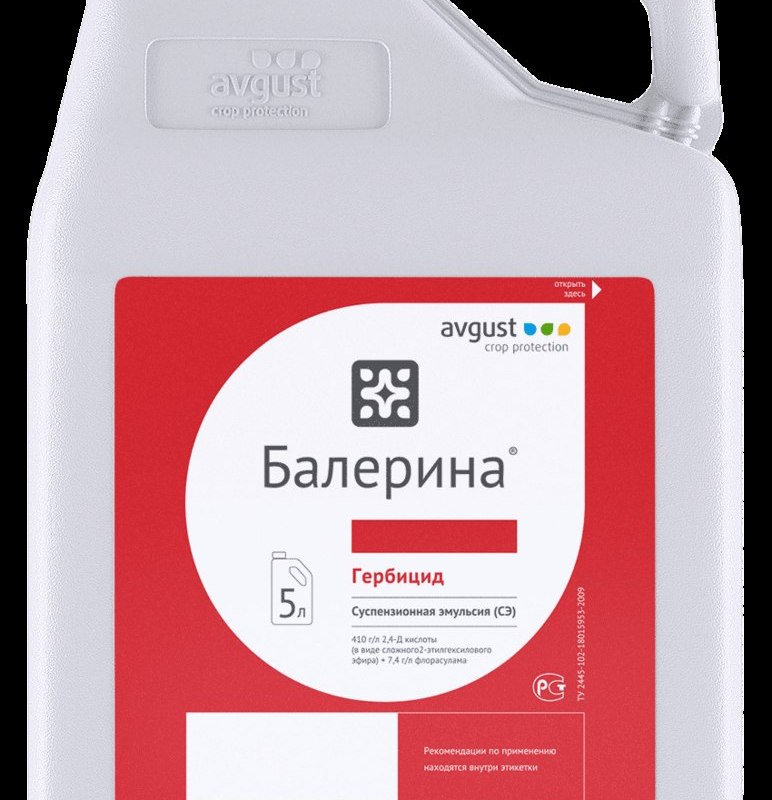 Особенности применения: однолетние двудольные сорняки наиболее уязвимы для балерины в фазе 2 - 6 листьев (высота 5 - 10 см), многолетние корнеотпрысковые – в фазе розетки до начала стеблевания.