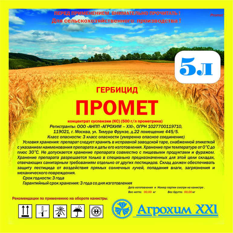 Спектр гербицидной активности: высокую чувствительность гербициду Промет проявляют следующие сорняки: ветвянка, вероника персидская, галинсога мелкая, виды горца, горчица полевая, двурядка степная, донник индийский, дурман обыкновенный, звездчатка средняя, крапива двудомная, крестовник обыкновенный, марь белая, овсюг, очный цвет, паслен черный, осот розовый, прицепник липучковый, вид просвирника, просо куриное, редька дикая, росичка кровяная, череда, виды щетинника, щирица запрокинутая и др., канатник Теофраста и др.