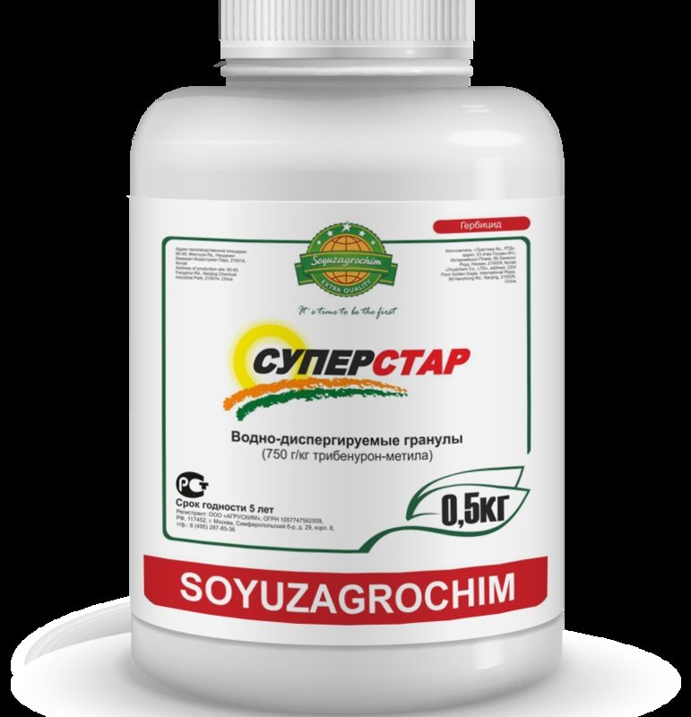Суперстар, ВДГ - послевсходовый гербицид для уничтожения двудольных сорняков в посевах зерновых культур и устойчивых к трибенурон-метилу гибридов подсолнечника, а также в лесных питомниках.