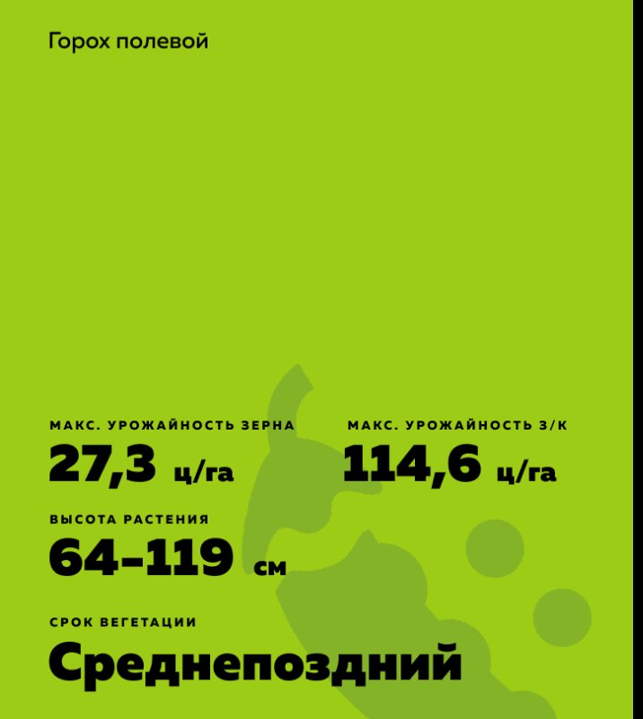 Pisum sativum L.). Безлисточковый, неосыпающийся. Рекордсмен по содержанию белка в зерне. Пригоден для смешанных посевов на зеленую массу и экспортного рынка.