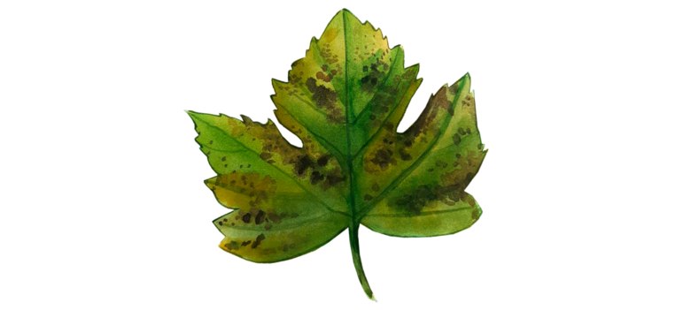 - Побеги и листья покрываются мелкими светло-желтыми или серебристыми пятнами, позднее они некротизируются, темнеют и приобретают коричневый окрас (сложно дифференцировать от оидиума). В случаях тяжелого поражения листья усыхают и опадают.