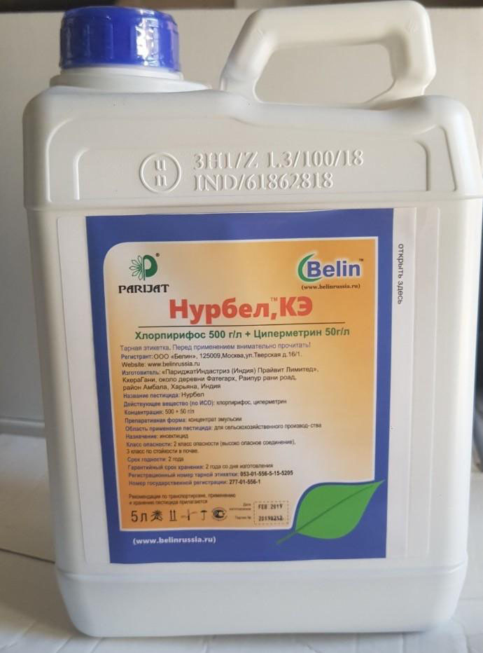 Нурбел, КЭ - высокоэффективный инсектицид против широкого спектра вредителей: долгоносиков, листоедов, пьявиц, хлебных жужелиц, блошек, пилильщиков, плодожорок, минирующих молей, листоверток, совок, шелкопрядов, тлей, трипсов, медяниц, щитовок, ложнощитовок, клопа-черепашки, саранчевых и лугового мотылька, а также клещей, устойчивых к фосфорорганическим соединениям.