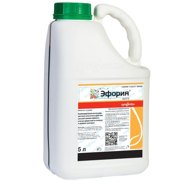 Эфория, КС — комбинированный инсектицид, обладающий контактной и системной активностью против широкого спектра вредителей на всех жизненных стадиях, от личинки до имаго. Обладает высокой эффективностью против вредителей зерновых и овощных культур.