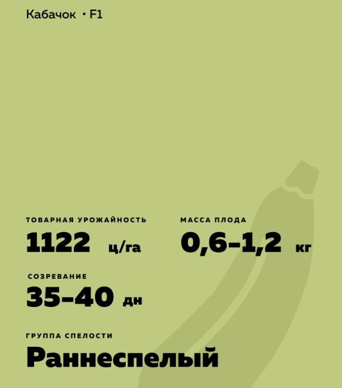 Cucurbita pepo L.). Раннеспелый для открытого грунта и плёночных теплиц. Плод цилиндрический, тёмно-зелёный. Для свежего потребления и переработки. Не сбрасывает завязь. Пластичный.