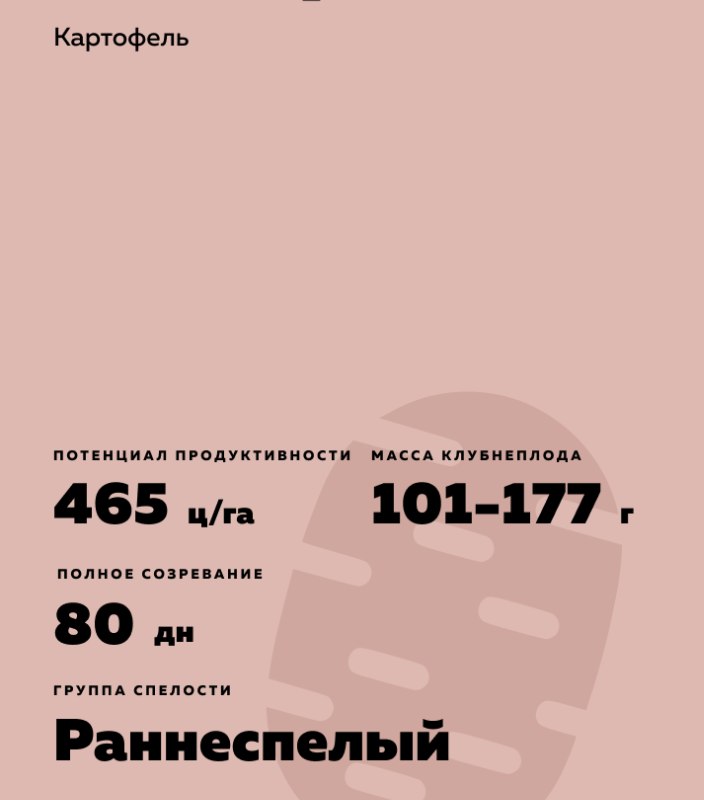Solanum tuberosum L.). Раннеспелый. Клубень овальный, кожура светло-бежевая, мякоть кремовая. Предназначен для реализации на рынке раннего картофеля и для продажи в мытом виде. Подходит для приготовления пюре, салатов, супов и жарки.
