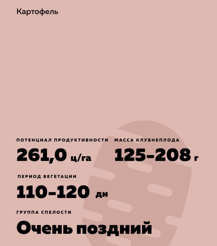 Solanum tuberosum L.). Тип растения: устойчив к раку, патотип I и к золотистой картофельной нематоде (R01). Срок созревания (гр. спелости): очень поздний. Направление использования: столовый.