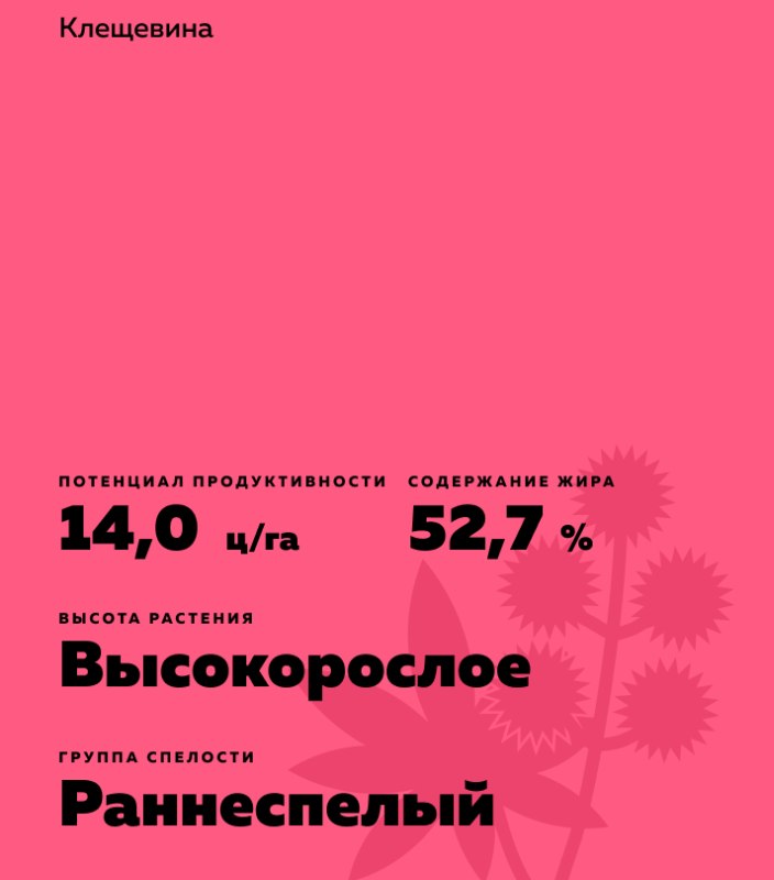 Ricinus communis L.). Сорт предназначен для производства касторового масла, пригоден к возделыванию по интенсивной технологии.