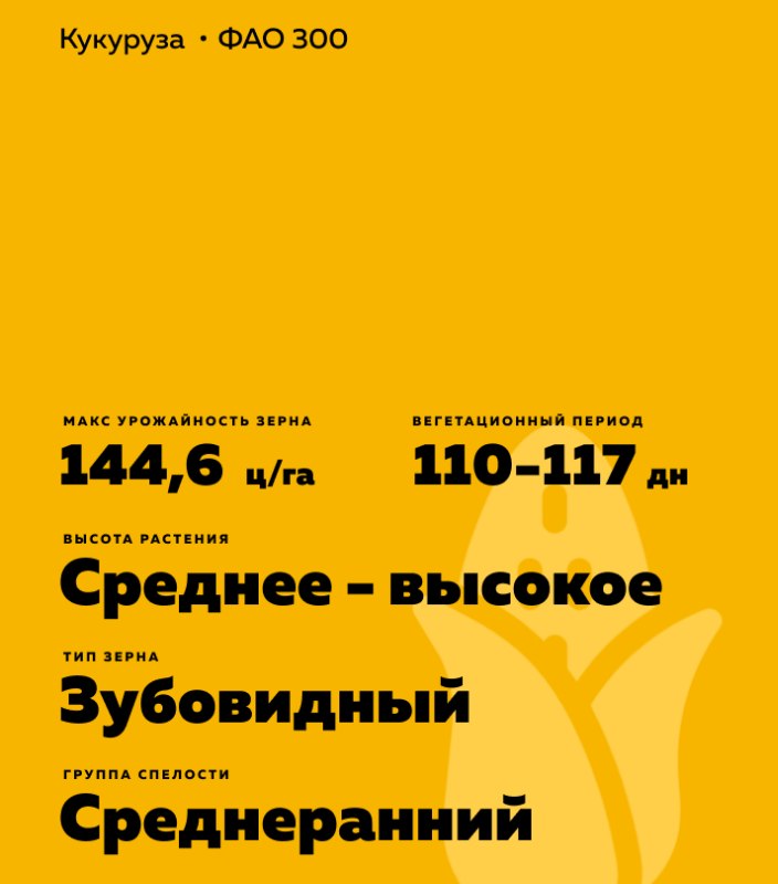 Zea mays L.). Среднеранний ФАО 300. Высокая устойчивость к полеганию и засухе. Технология: Классическая. Назначение: Зерно.