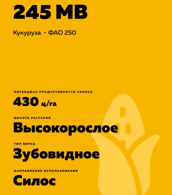Zea mays L.). ФАО 250. Среднеранний. Стабильный урожай силоса. Раскрывает свой потенциал в условиях достаточного увлажнения.
