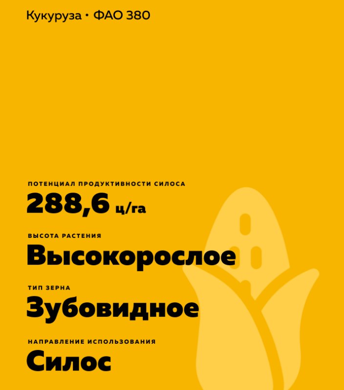 - Включён в Госреестр по Центрально-Чернозёмному (5) региону на силос. Высокое содержание крахмала в зерне и отличная переваримость НДК позволяет заготавливать высокоэнергетический силос с высокими качественными показателями.