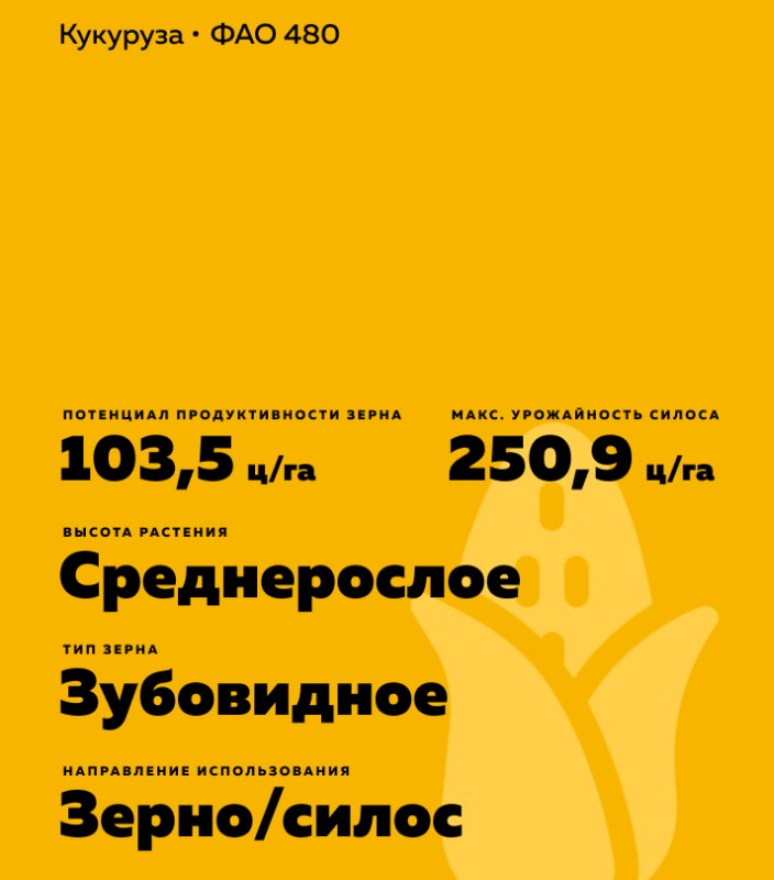 Zea mays L.). ФАО 480. Среднепоздний. Назначение: силос. Высокая устойчивость к полеганию и засухе.