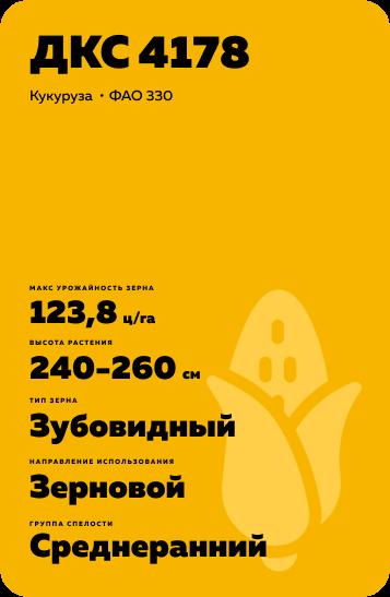 ДКС 4178 - гибрид кукурузы (Zea mays L.). Среднеранний. ФАО 330. Высокая устойчивость к засухе и холоду. Высокая устойчивость к стеблевому кукурузному мотыльку. По данным оригинатора высоко устойчив к пузырчатой головне.