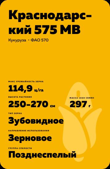 Краснодарский 575 МВ - гибрид кукурузы (Zea mays L.). Позднеспелый. ФАО (570). Гибрид устойчив к болезням, хорошо приспособлен к механизированной уборке, влагоотдача при созревании зерна, засухоустойчив, отзывчив на хорошие условия выращивания.