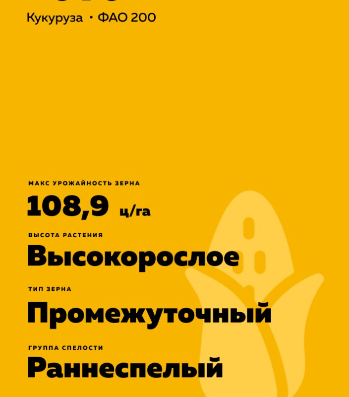- Тип зерна промежуточный, ближе к кремнистому. Окраска верхней и нижней части зерна жёлтая. Антоциановая окраска стержня початка имеется. Интенсивность антоциановой окраски стержня початка средняя.