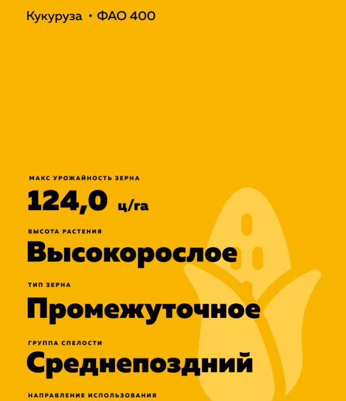 - Тип зерна промежуточный, ближе к зубовидному, количество рядов среднее. Окраска верхней части зерна желтая, нижней - желто-оранжевая. Интенсивность антоциановой окраски стержня початка средняя.