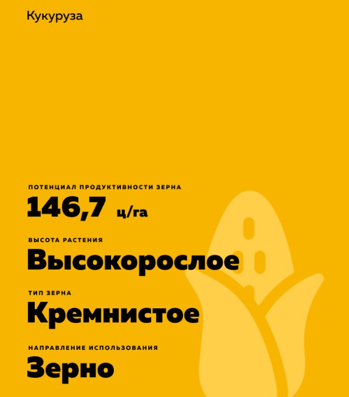 - Тип зерна промежуточный, ближе к кремнистому. Окраска верхней и нижней части зерна жёлтая. Антоциановая окраска стержня початка имеется. Интенсивность антоциановой окраски стержня початка средняя.