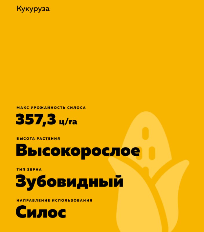 - Средняя урожайность нормализованного сухого вещества в Северо-Кавказском регионе составила 183,4 ц/га (+18,4 ц/га к стандарту), максимальная - 357,3 ц/га (Республика Адыгея, Гиагинский ГСУ, 2021 г.). Содержание сухого вещества в среднем составило 44,5 %. Вегетационный период 92 дня.