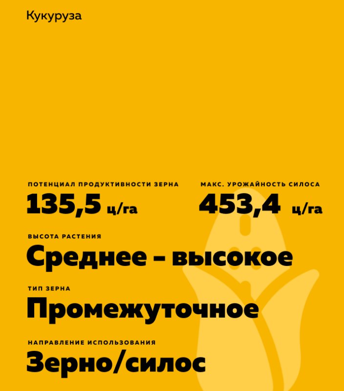 - Среднеранний простой гибрид. Включен в Госреестр по Центрально-Черноземному (5) и Средневолжскому (7) регионам на зерно и силос.
