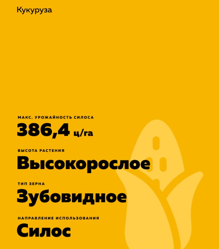 - Средняя урожайность по региону составила 198,5 ц/га (+15,8 ц/га), максимальная - 386,4 ц/га (Краснодарский край, Лабинский ГСУ, 2020 г.). Сухое вещество 38,9 %.