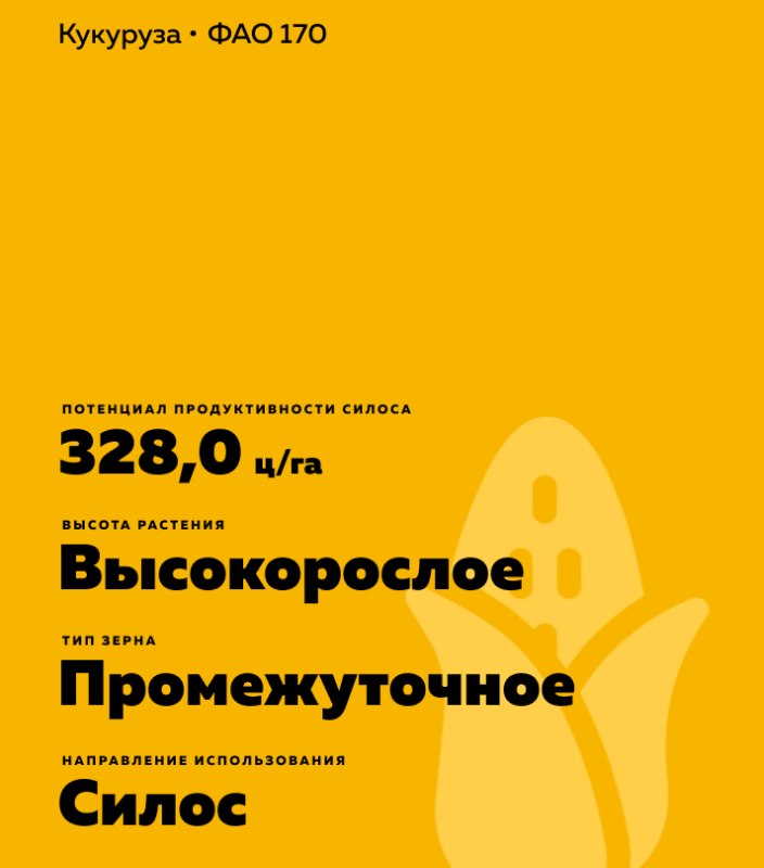 - Данный гибрид обладает быстрым стартом и ранним развитием, высоким потенциалом силосной массы и отличной переваримостью клетчатки. Данный гибрид является незаменимым звеном в "зеленом конвейере" способный обеспечить ваши хозяйства высококачественным силосом.