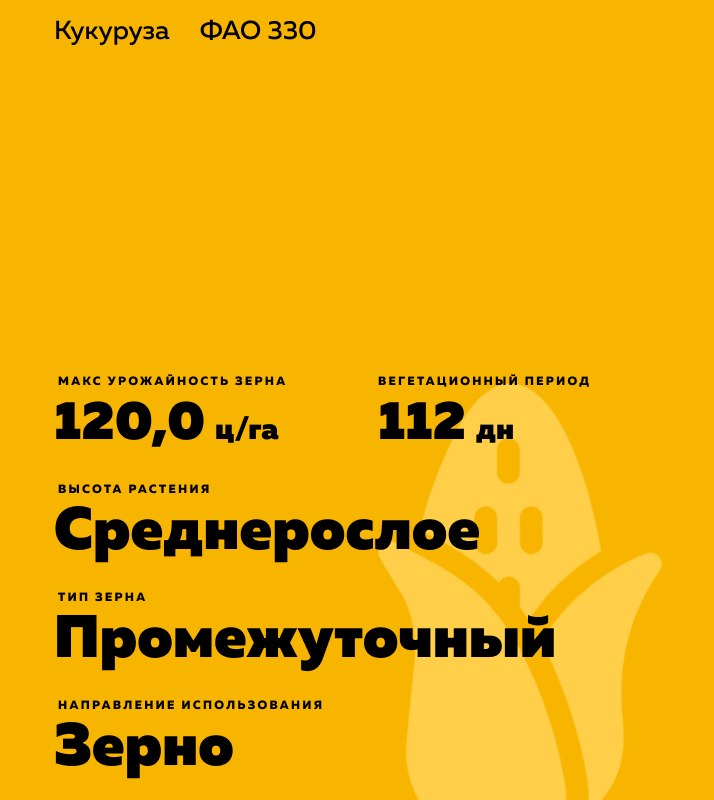 - Среднеспелый простой гибрид. Вегетационный период 112 дней. Время цветения метёлки раннее. Быстрый старт и раннее развитие.