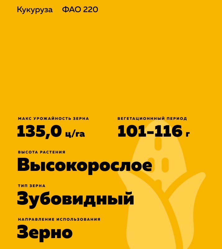 Zea mays L.). Среднеранний. ФАО 220. Высокая устойчивость к полеганию и засухе. Эффективен для выращивания на крупу (60,5%).