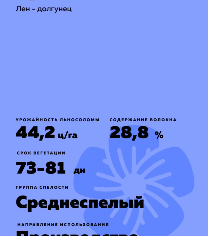 - В Центральном регионе средняя урожайность льносоломы - 30,9 ц/га, семян - 5,6 ц/га, у стандарта соответственно: 28,6 и 5,4 ц/га. Масса 1000 семян - 4,9 г. Содержание волокна - 28,8%, выход длинного волокна - 25,3%, относительная разрывная нагрузка расчетная - 12,5 ДаН. Вегетационный период - 73 дня.
