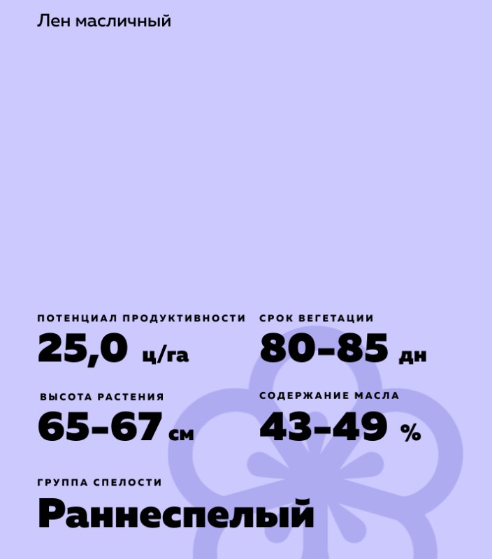 Linum usitatissimum L. var. intermedia Vav et Ell.). Раннеспелый. Слабо реагирует на недостаток влаги в почве.