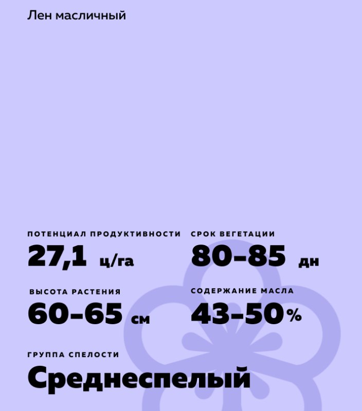 Linum usitatissimum L. var. intermedia Vav et Ell.). Выскомасличный, среднеспелый. Устойчив к осыпанию. Не реагирует на изменение длины дня.
