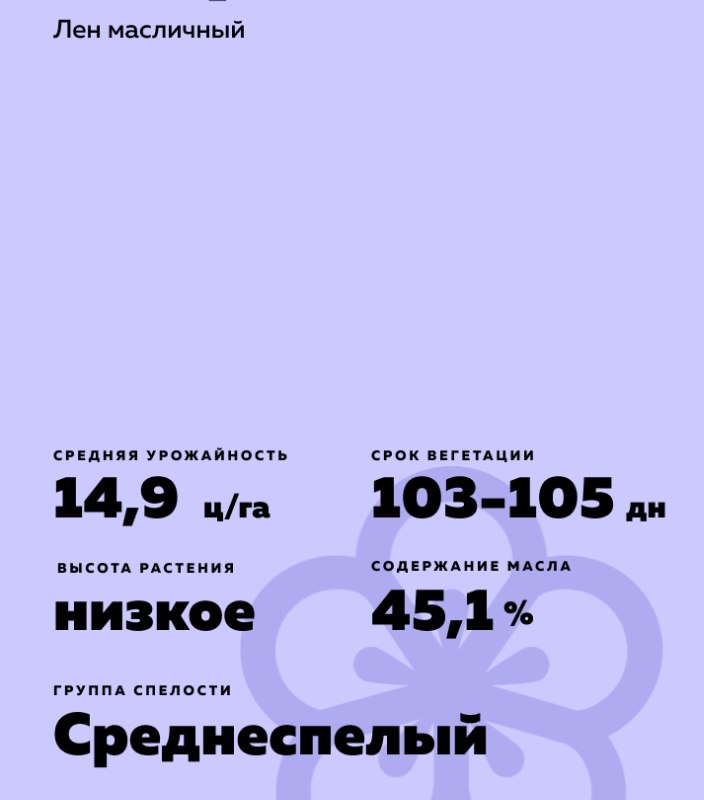 Linum usitatissimum L. var. intermedia Vav et Ell.). Среднеспелый. Окраска венчика фиолетовая. Высокоустойчив к полеганию и осыпанию.