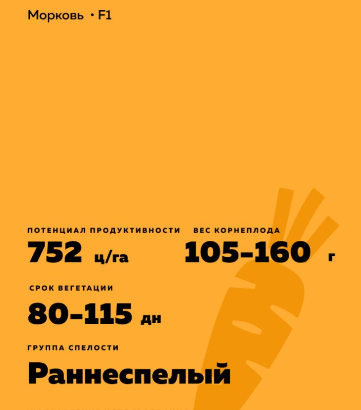 - Товарная урожайность - 362-569 ц/га, на уровне стандарта Шантенэ 2461 и на 39 ц/га выше стандарта Карсон F1.
