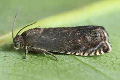 🔶 Имаго в размахе крыльев обычно достигает 11-16 мм. Передние крылья темно-коричневые или коричнево-серые с металлическим блеском. У переднего края крыла имеется несколько светлых полосок. От наружного края крыла к его основанию полоски постепенно уменьшаются. Между светлыми полосками имеются темные штрихи, перпендикулярные наружному краю крыла. У заднего края несколько темных крапинок с белым запятовидным пятном. Задние крылья желтовато-белые, по краю буроватые.