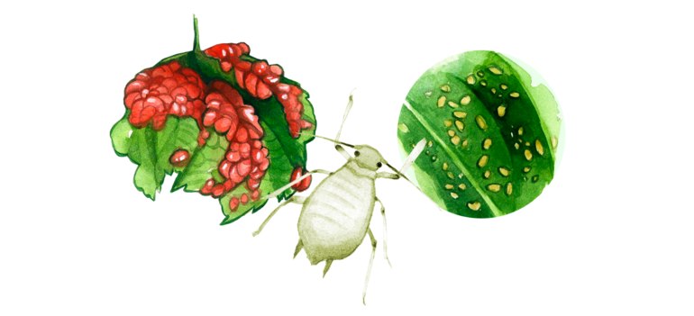 🔸Листья деформируются, образуются характерные галлы, возможно опадение. Продуктивность фотосинтеза снижается до 23%.