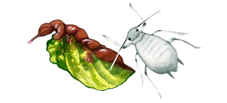 - Основательницы поселяются на верхушках молодых листьев. Личинки питаются на периферических участках листьев, края их утолщаются и заворачиваются, поверхность краснеет.