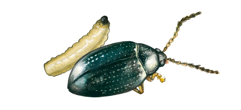 🔵Жуки проедают дырки в молодых листьях, ущерб только при сильном поражении. Личинки объедают черешки листьев и стебли. Сильное поражение приводит к повышенному риску вымерзания, метловидному росту побегов и большей подверженности заболеваниям (фомозу).