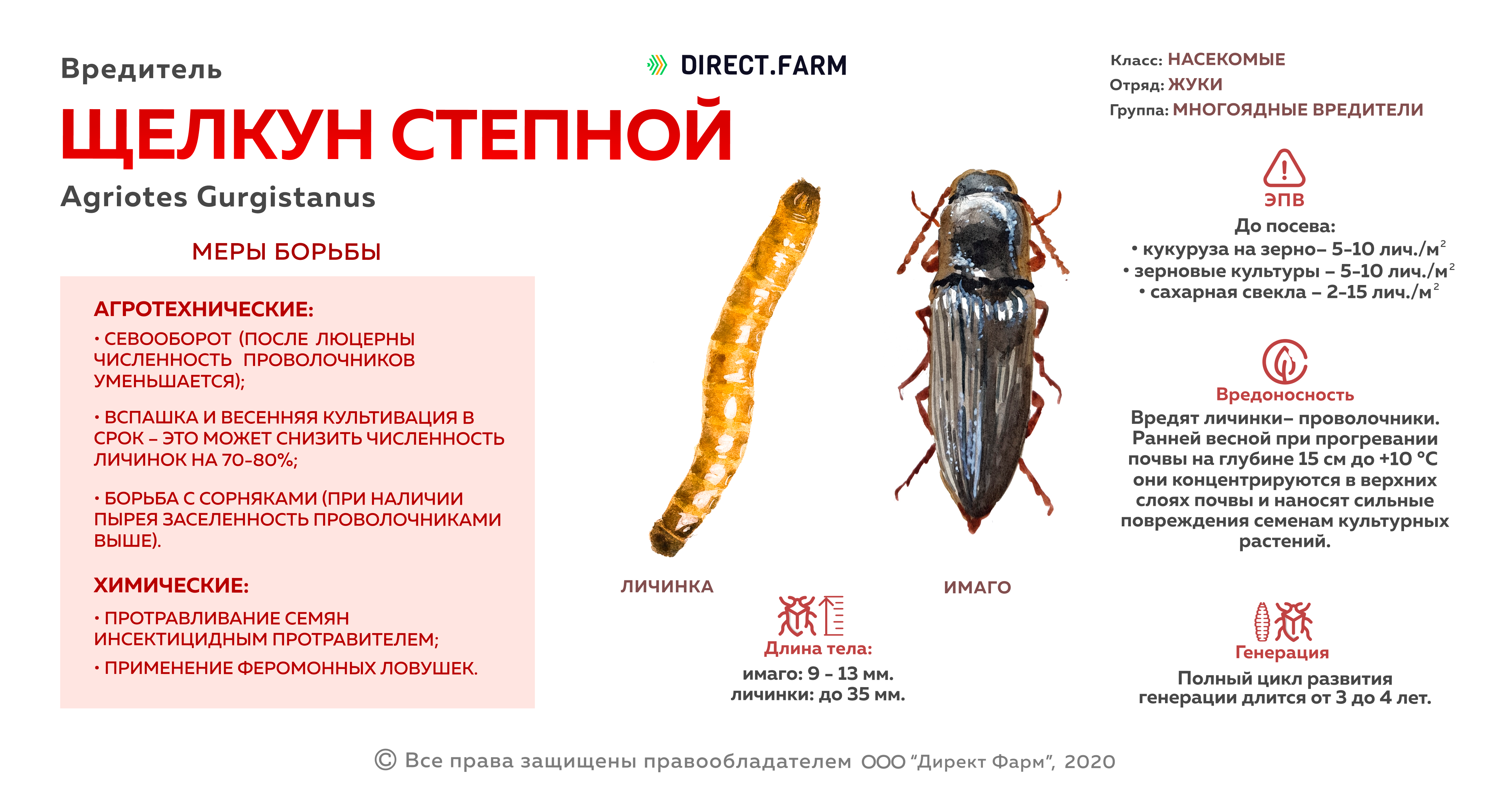 - Соблюдение севооборота (после люцерны численность проволочников уменьшается).