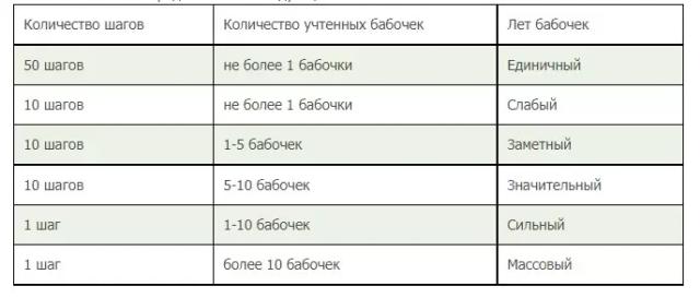 🔶 Учет бабочек производится путем подсчета особей, взлетающих в поле зрения наблюдателя, на определенное число шагов. При этом утром и вечером следует передвигаться так, чтобы тень не падала вперед, так как изменение освещения вспугивает бабочек сразу с большой площади.